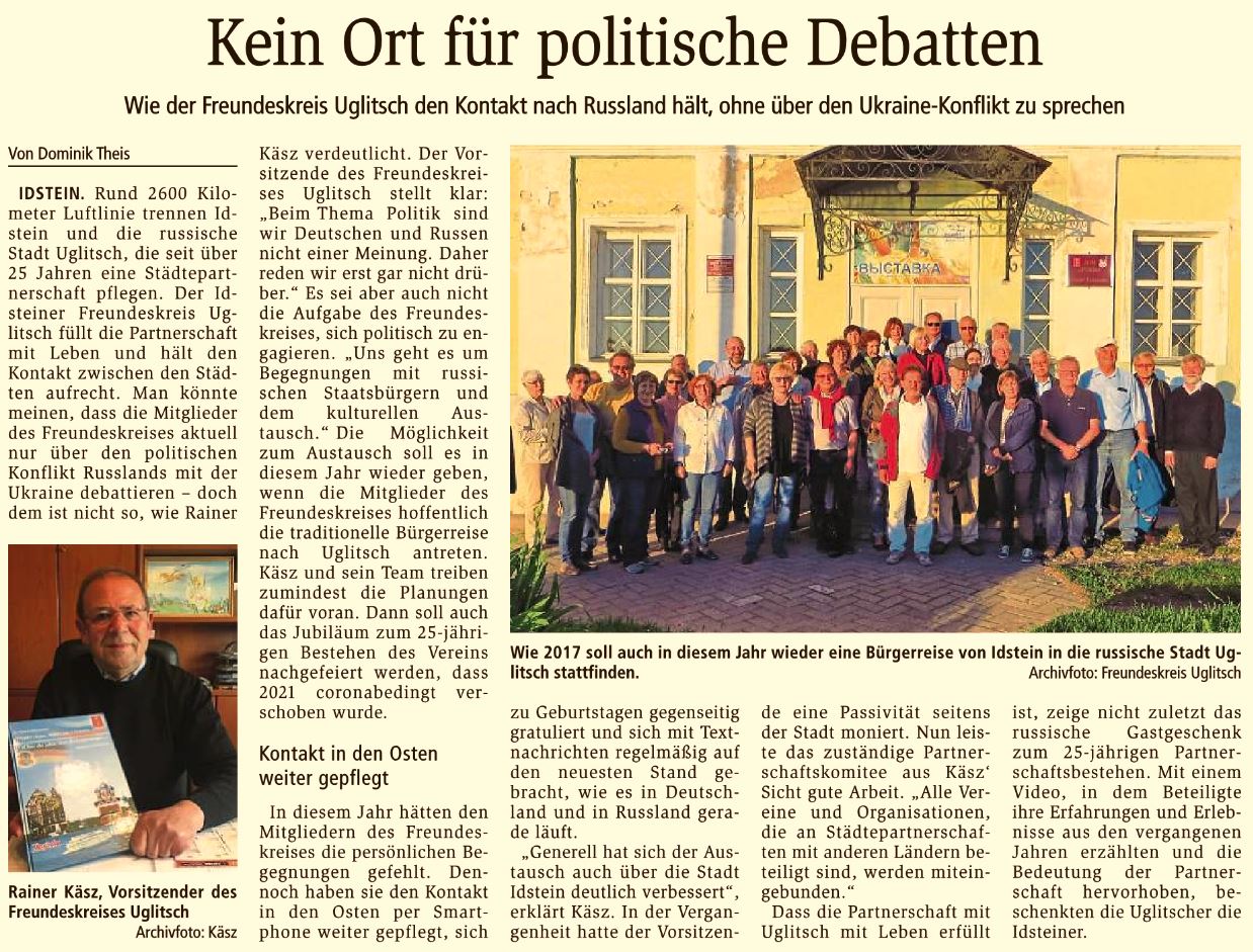 IDSTEIN. Rund 2600 Kilometer Luftlinie trennen Idstein und die russische Stadt Uglitsch, die seit über 25 Jahren eine Städtepartnerschaft pflegen. Der Idsteiner Freundeskreis Uglitsch füllt die Partnerschaft mit Leben und hält den Kontakt zwischen den Städten aufrecht. Man könnte meinen, dass die Mitglieder des Freundeskreises aktuell nur über den politischen Konflikt Russlands mit der Ukraine debattieren – doch dem ist nicht so, wie Rainer Käsz verdeutlicht. Der Vorsitzende des Freundeskreises Uglitsch stellt klar: „Beim Thema Politik sind wir Deutschen und Russen nicht einer Meinung. Daher reden wir erst gar nicht drüber.“ Es sei aber auch nicht die Aufgabe des Freundeskreises, sich politisch zu engagieren. „Uns geht es um Begegnungen mit russischen Staatsbürgern und dem kulturellen Austausch.“ Die Möglichkeit zum Austausch soll es in diesem Jahr wieder geben, wenn die Mitglieder des Freundeskreises hoffentlich die traditionelle Bürgerreise nach Uglitsch antreten. Käsz und sein Team treiben zumindest die Planungen dafür voran. Dann soll auch das Jubiläum zum 25-jährigen Bestehen des Vereins nachgefeiert werden, dass 2021 coronabedingt verschoben wurde .